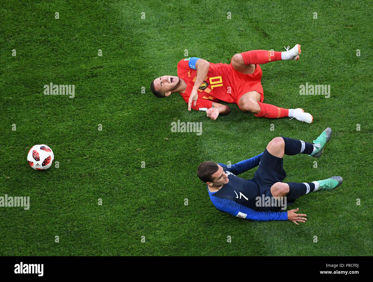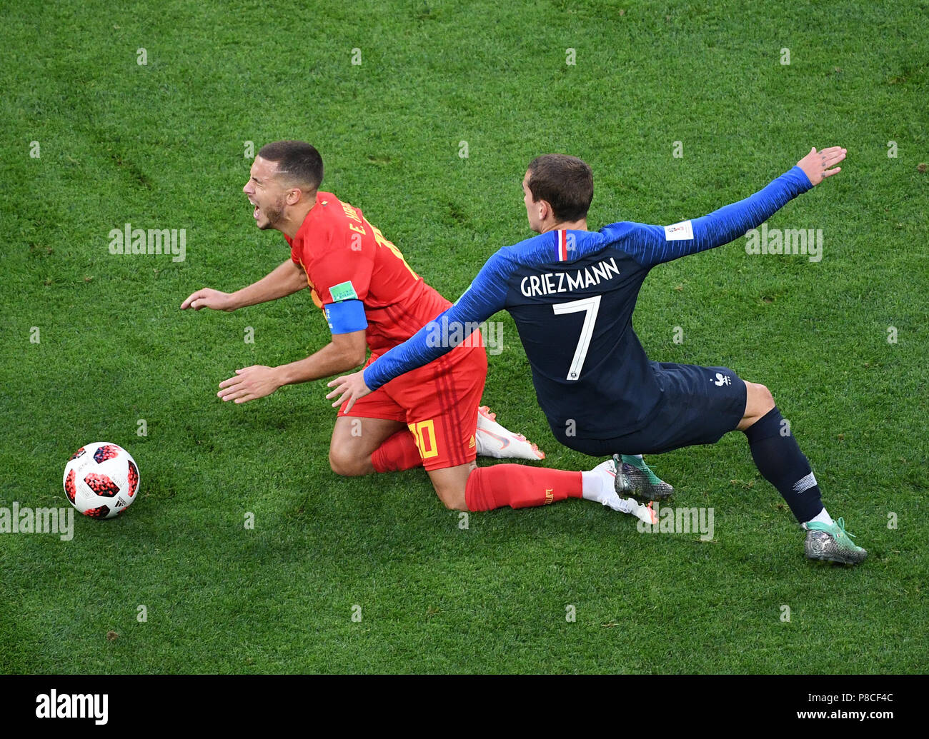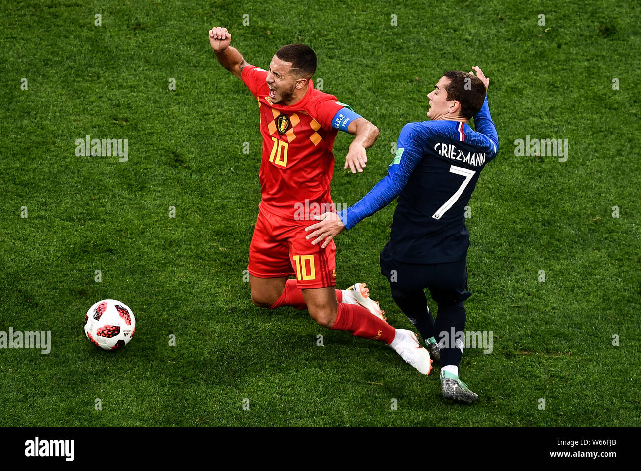 Eden Hazard Of Belgium And Antoine Griezmann Of France Fall On The